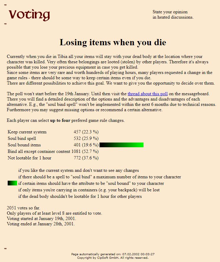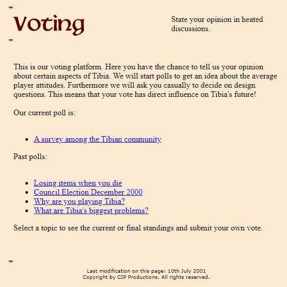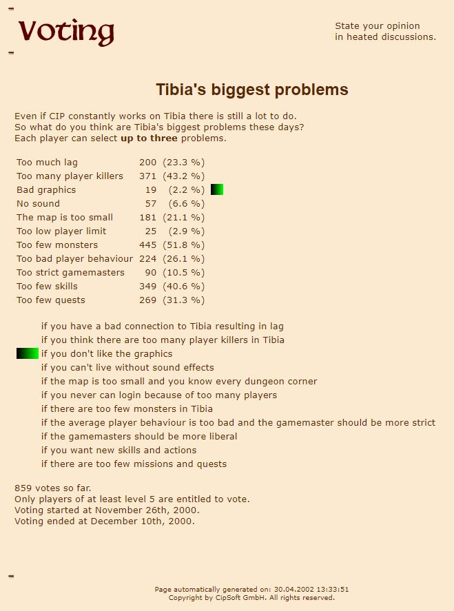 CIP also launched a new feature on the website called "voting poll" which allowed players to vote on topics CIP posted with their characters. Each character could cast one vote using the same method of logging into the forum to confirm their legitimacy. CIP experienced problems with the vote system right away, producing an "illegal vote" error when players tried to submit their vote. Once this was fixed the first poll was made on November 26th, 2000 titled "Tibia's biggest problems". In this poll players could select up to 3 issues they had had with the game. From the results it looks like too few monsters, PKing, and too few skills were considered the most urgent. Looking at the least voted for issues it looks like TIbians mostly liked the graphics and found no issue with the player limit. Also note how only 6.6% of the 859 votes felt that a soundless Tibia was a problem (hint hint).