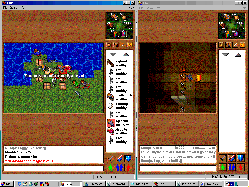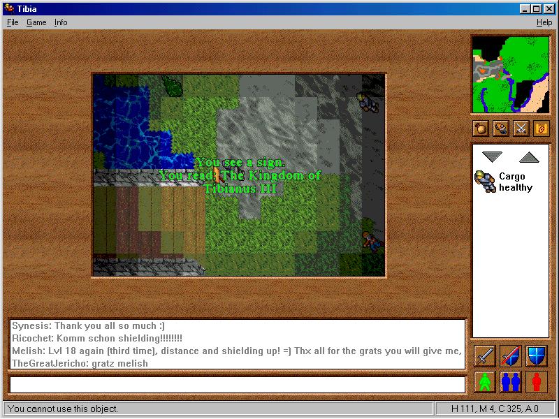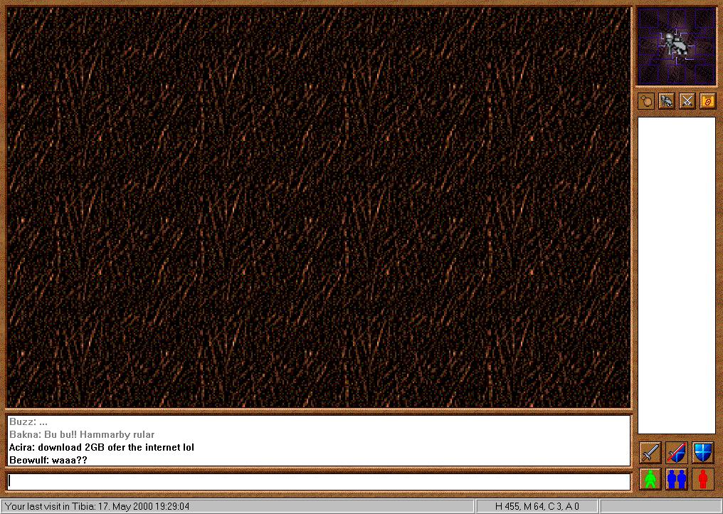 The client was also improved to reduce the amount of screen bugs by adjusting how it communicated with the server. This small change would finally eliminate many of the hilarious bugs around logging in only to find that the GUI menu was the only thing that loaded. The Tibian client also had one other small change, the knight statue which brought you to the skill and character states would now be replaced with a Tibian avatar which did the same thing.