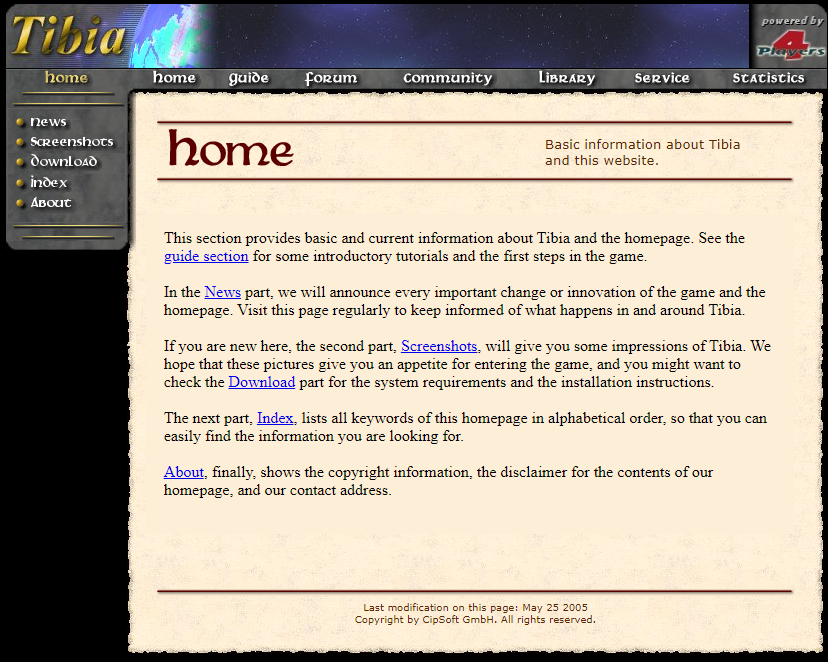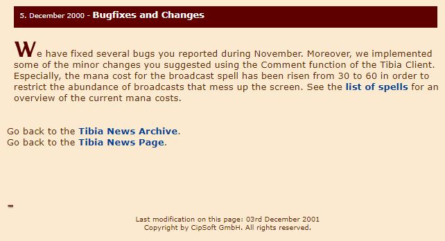 The new website now also included a nice mini summery of the history of Tibia, which briefly chronicled their path from Alpha 1 to Beta 6. This important history summery formed the original basis for my own research and offered players a look into the then recent past of the game. Most players would not have played during these early years and looking at early versions of WoT, the history of the game was important to players during this period. It is interesting to note that CIP has created many more of these history vignettes, but details seem to change with every iteration. I have added these to the website so you can check them out for yourself in the resource tab.