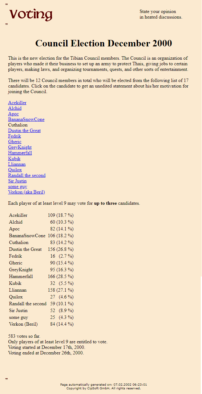 One final interesting poll from this period is a strange and seemingly short-lived council election which was to be made up of 12 players. The council was designed so that players would set up an army to protect Thais, give jobs to players, make laws, organize events like tournaments and quest, and provide entertainment. Despite extensive looking I couldn't find a single piece of information on this. You can click on some of the names and see the statements of the candidates, and if you are an old player, you might recognize some of these names as belonging to the former IRT guild. Perhaps this council morphed into the foundation of the IRT? Whatever CIP intended, it never made it out of the voting stage and was forgotten about entirely.