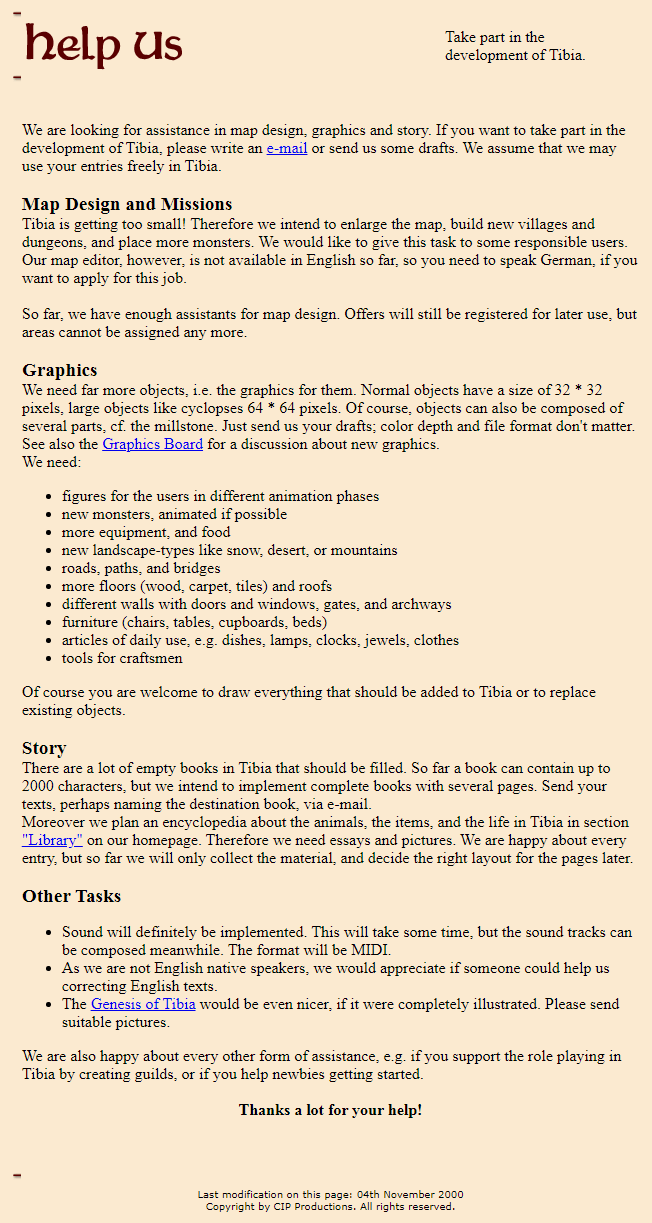 The four CIP members, wanted to add many new features to Tibia. Through an article on the website we can see that they planned to add sound, provide players with alternate ways to earn experience such as through quests, and even develop a crafting system. They wanted to improve every aspect of Tibia from increasing the number of monsters and items to adding more player created content. Even improving monster AI and redesigning the fundamental parts of Tibia like vocations and magic were being considered. Tibia was now moving away from the basement school project to the more open possibility reality of a professionally managed game. Players thought some of these changes might take months or a year, but the reality was many took decades, if at all, as CIP continued to create new content at the same slow pace.