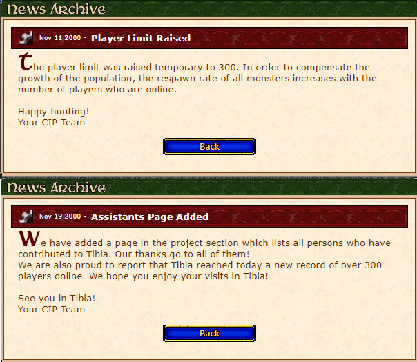 With more players able to access the game, it was time to finally increase the maximum amount of players online to 300 which occurred on November 11th. Just 8 days later the cap would be hit for the first time. Players had constantly complained that the monsters respawned too slow, so to help CIP changed the rate to spawn faster when more players where online. This made playing at peak times much more reasonable, reducing the waiting between respawns.