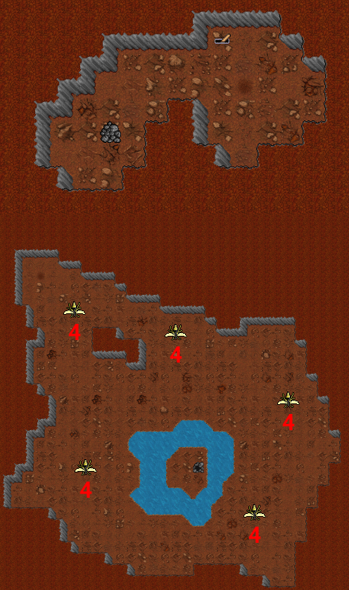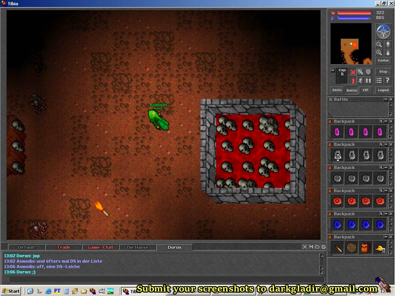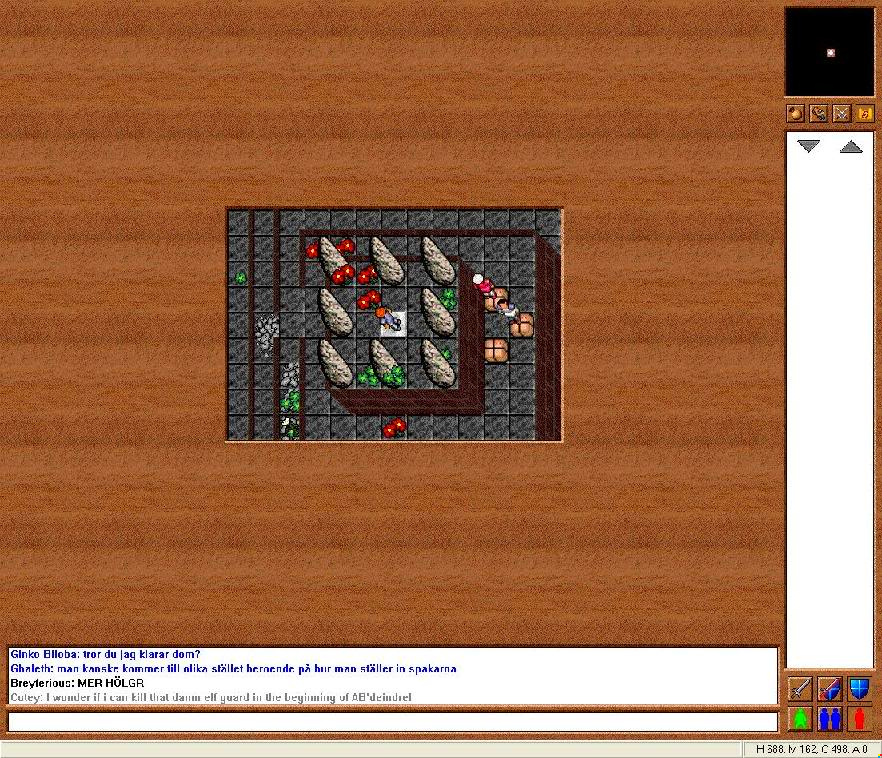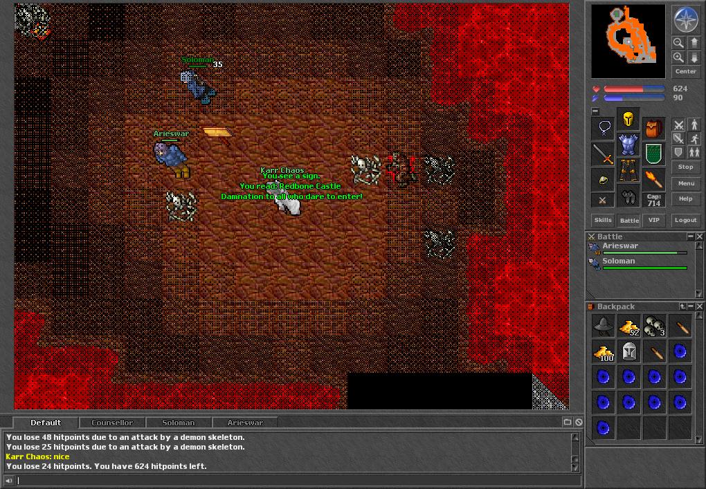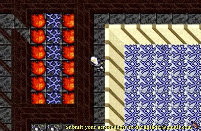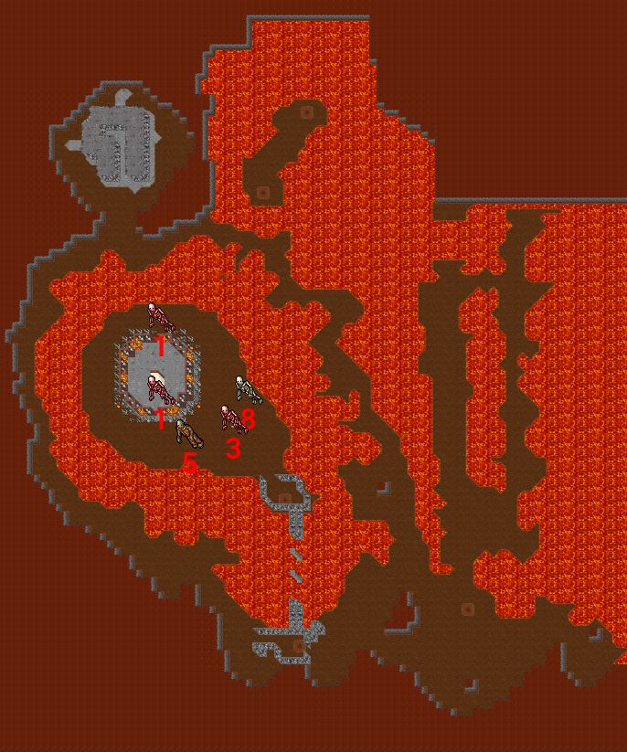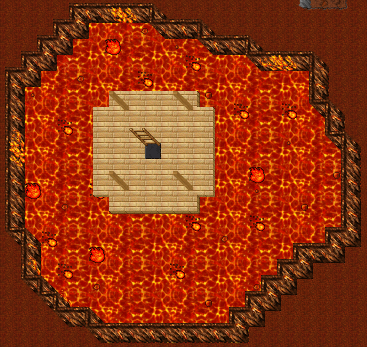 Going east from the platformed library led you to a smaller version of the red brick house which was the one you saw on the way down. Stairs led up and down into a room which you could hunt the same type of undead and Beholder monsters in. Five more of these house style dungeons where north of this. There was also a lava pit with skulls on rocks which gave off a red glow and was guarded by slimes to the north.