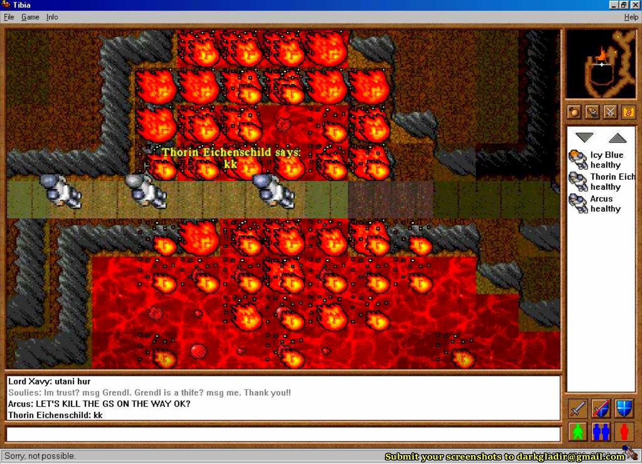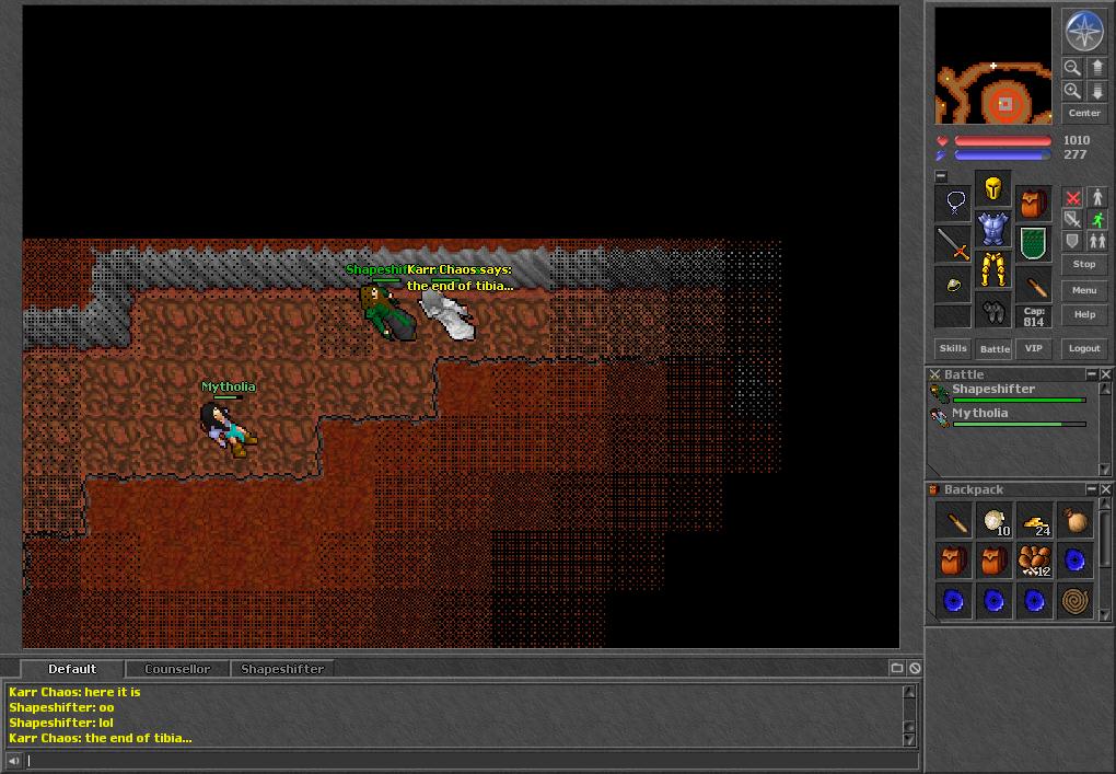 Back out at the split, keep going east, which led the long way around to what looked like the top of the map at the time. The area just beyond the wall was black and looking at maps it seems that this was the edge of the Tibian world. Though the path continued south and east, only the east path led out with the other being a dead end. This floor led south to a huge rot room which was a decent place to level at.