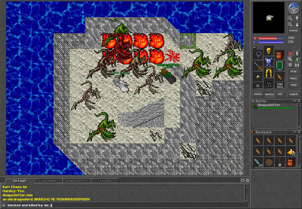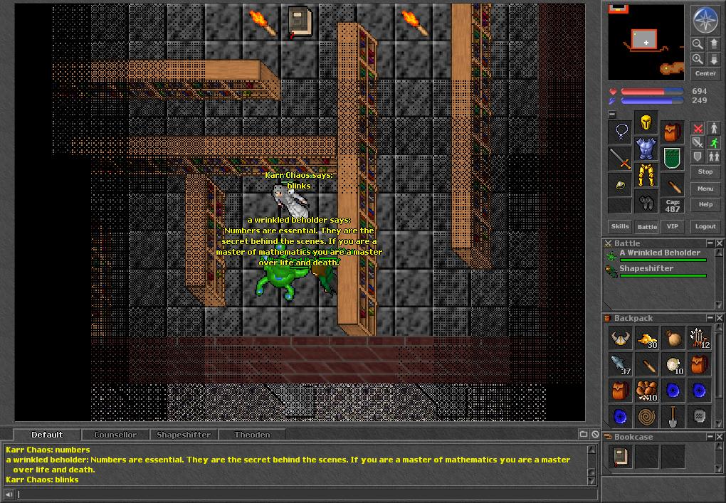 Heading east into the room, you would see a lava pit with skulls and further along a red brick building which sprawled two floors. A staircase led up and down into a small room of Slimes, Ghouls, DS, and Beholders which was quite a lot. Continuing east led to pillared and gravel area which had a staircase leading up to an unexpectedly huge library. This library was staffed by NPC A Wrinkled Beholder who was, unsurprisingly, a Beholder. If you spoke with him, he would remark that he would kill you, but only after he had investigated you and wrote down his findings. The ocularly abundant NPC would tell you about the Beholder language 469 which used a mathematical numbered system to communicate. From speaking with him we know that Tibia was called 1 and the NPC was called 486486, though people called him "Blinky”. If you called him that he would hit you with a burn creature rune as punishment for being rude. Similarly rude was the number 0 though how wasn't very clear.