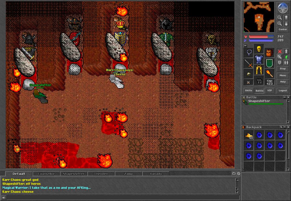 Heading west at the initial entrance to the area led to two more of the red brick house spawns. South of these were a small trail which led to a dropdown hole. The massive room it dropped you in was the lowest floor in Tibia and was filled with lava. From here there was two ways out of the dungeon, but only if you came prepared.