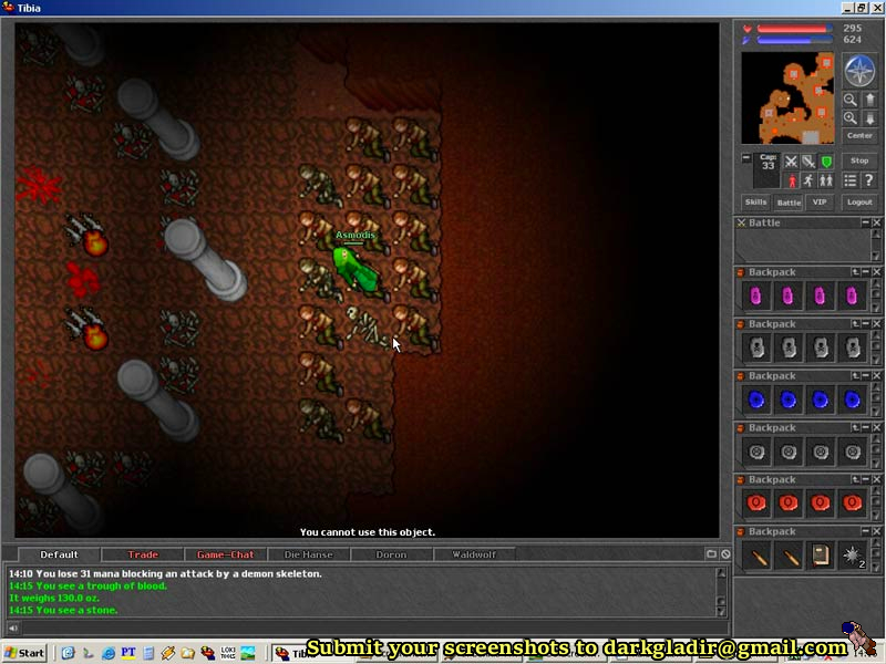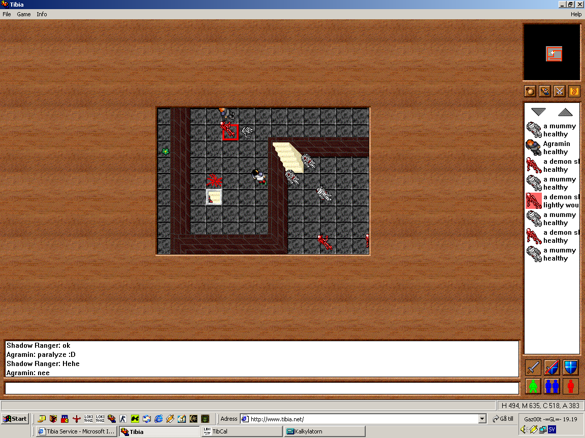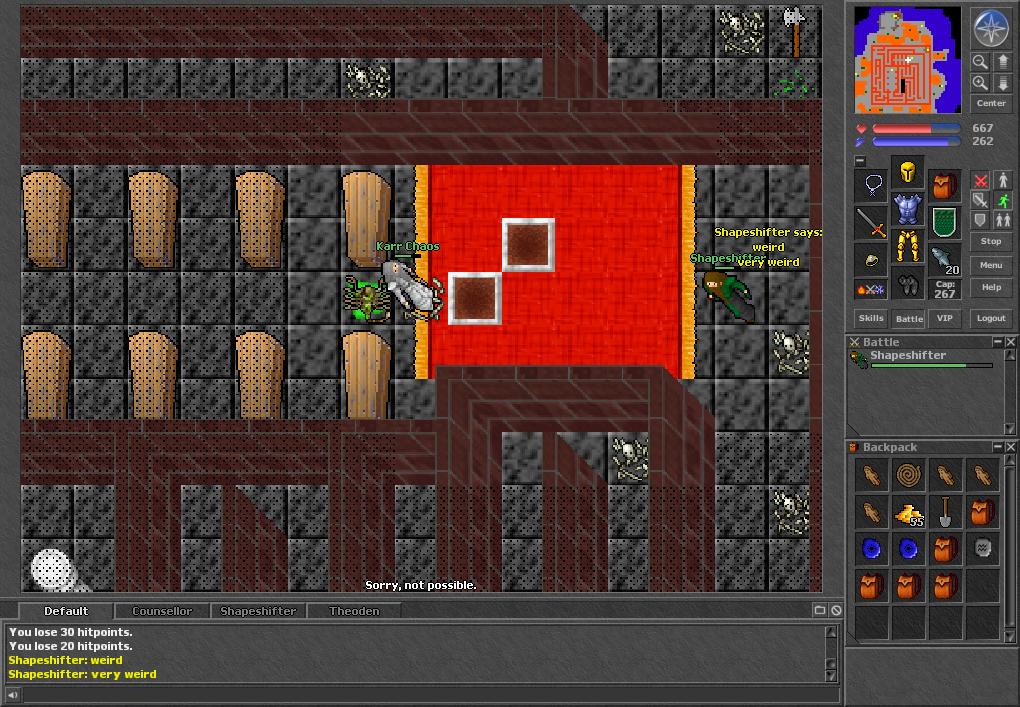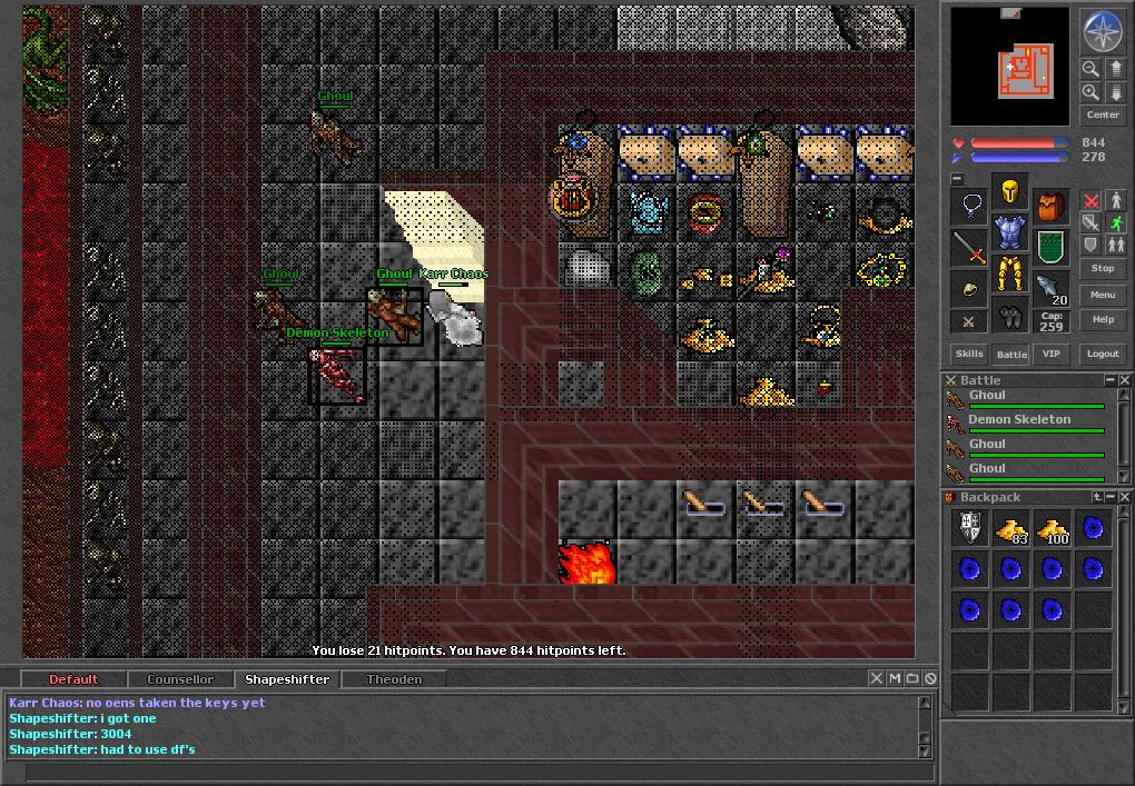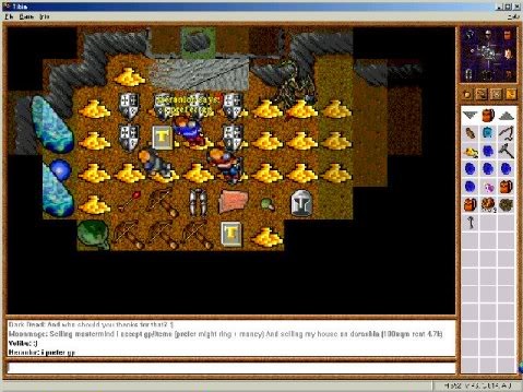 Behind the westernmost finger was a Dark Helmet, Spike Sword, Dark Armor. The next one had a Devil Helmet, Demon Shield, and Serpent Sword. Beside this one had some real Tibian rares consisting of a Crown, Blessed Shield, Crystal Wand, and I think a Studded Armor under it. Next over was a Strange Helmet, DSM, and Ice Rapier and beside that was a HotS, Double Axe, Dwarven Shield, and I think Golden Armor. Many players would make a pilgrimage over the years to this treasure room and though very few seemed to think this room was lootable, some did wonder why the room was here. Who were the dead bodies inside and how did their equipment end up there?