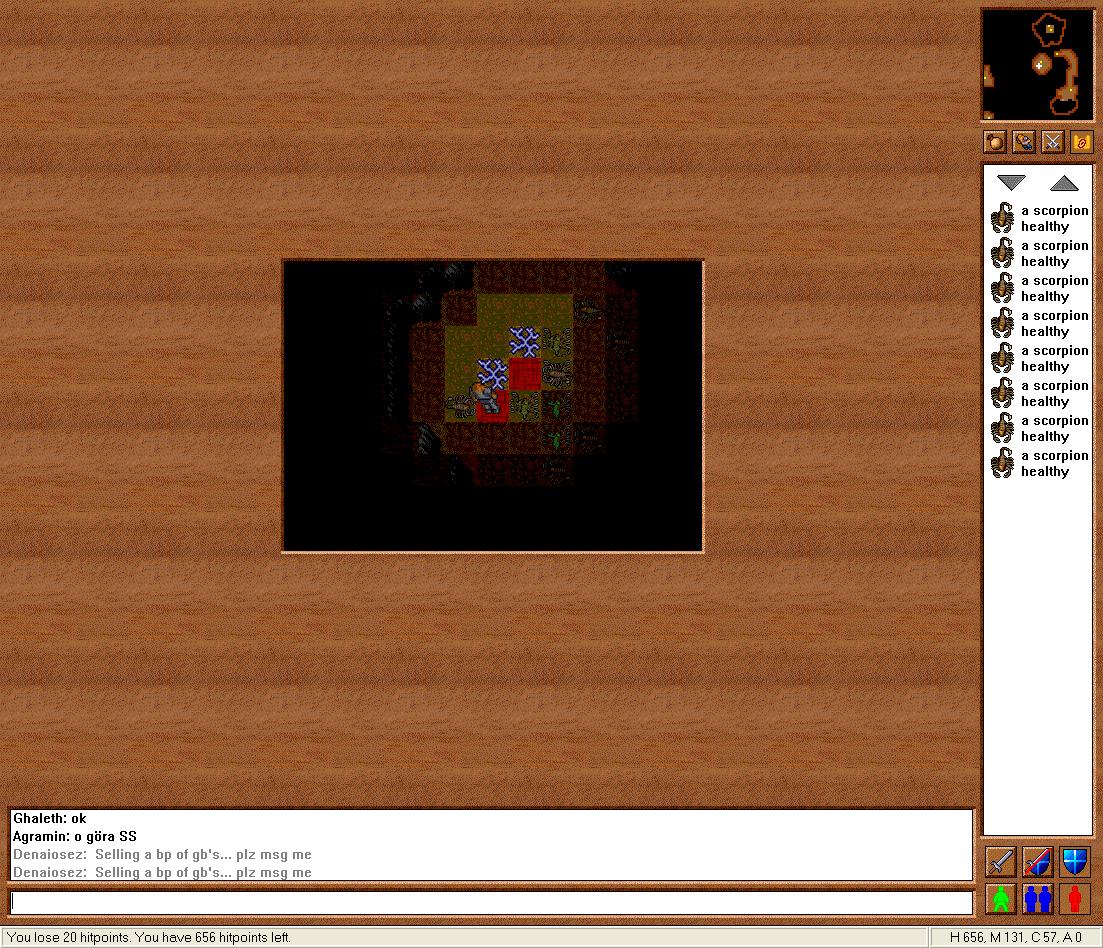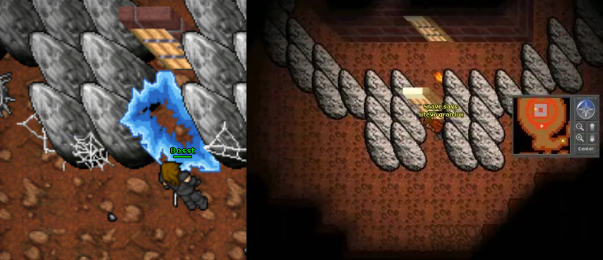 Once you had finished burning the sight into your mind you could return to where you came up and head west and down a long path which led up to a small room. This is a video of the journey. Once you roped yourself into this room there was no way back as the lose stonepile was a small hole. A switch on this floor by the rope up would open the bridge on the next floor which was a huge wasp cave. Once up you would see that you were on an island underground which was surrounded by water and could only be traveled by retractable bridge by the switch below. This spot was a well-known PK hiding place as they would keep a char at the switch and flip it open and closed to let their PK char inside. Many players battled inside the switch room to get at those who tried to hide in there, but only if you had a char logged out there yourself as the walk to get to the room was too long to beat the PZ lock.