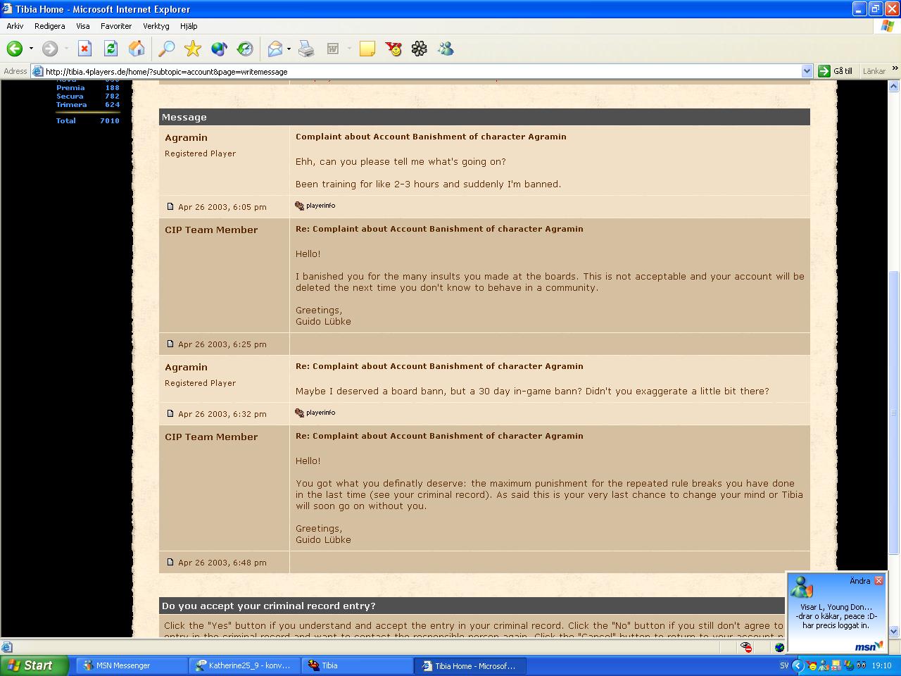 With these new powers and with the introduction of paid accounts through the Premium system, it was now necessary to add a formal system of complaint to provide integrity to the system. This system would bring in CIP or their representative to review and decide if a ban were fair or if it should be shortened, or even cancelled. In some cases, a ban might even be extended if the player lied about the circumstances which led to the ban. The criminal record addition also made it possible to issue formal namelocks and keep track of players who were deliberately causing grief or mischief like by impersonating other players through name fakes. Namelocks were initiated by a GM command which would kick the character and block them from logging into the game until a new name was submitted through the account. This feature, added December 7th, was a great help to GMs. In an effort to make sure the namelock didn't cause undue harm, GMs would almost always teleport to the player prior to banning them for a namelock to ensure that they were not harmed while they displayed an item in the depot or were in a dangerous hunting spot.