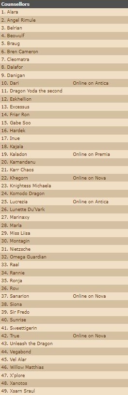 To become a Counsellor, you had to write an application in the "Gamemaster Board" on the official forum or be appointed to the position by a GM. Those who best fit the role was those who were considered "a trustworthy person and experienced adventurer". Players who accepted the role followed the direction of all Gamemasters and were expected to not misuse the powers they were given. This was a volunteer role, so no compensation was provided or expected.