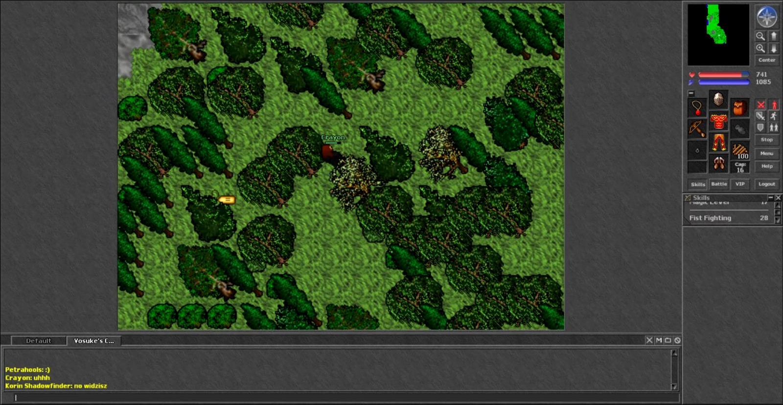 Back on the surface you could continue heading northwest through the small line of trees between the water to the south and abandoned house on the hill to the north. Strangely you would find a ring of white mushrooms which spawned just beyond this natural border. Continuing through the dense trees to the west you would find a stone circle ring of large stones which looked like Stonehenge. Players liked to practice their UE spell here, as the UE spell was now reintroduced to the game and fit perfectly within the circle. North of this was the very odd Poison Tower which had no entrance but had strange poison clouds near the top which you could see. Depending on where you stood you would see rooms inside and stairs but there was no way to access this tower. This didn't stop players from trying all kinds of ideas to try to get in and it has remained a solid topic of discussion in the many mysteries of Tibia forums.