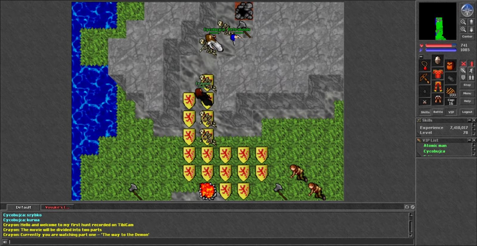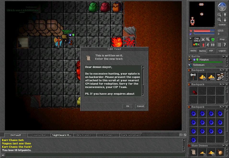 At the end of the hall was a ladder which took you to the floor below where four Demons in a white tiled room resided. Once you cleared the Demons in this room you could search for the leaver in the east side area which would drop a chest in the west. This chest contained the Blue Tome, 8 Small Amethysts, Ankh, Demon Legs, Guardian Halberd, Ring of the Sky, Dwarven Axe, and Medusa shield. Most of these items were outrageously rare. The quest was meant to only spawn once like most normal big treasure items but a mistake in the coding made it spawn every time at save. Players wouldn’t know of this yet because it was very hard to get to. I think it was Bubble who got it the first time but didn’t return as she thought it was a one-shot quest. Some months later another team tried it, and tried it the next day which produced more rewards.