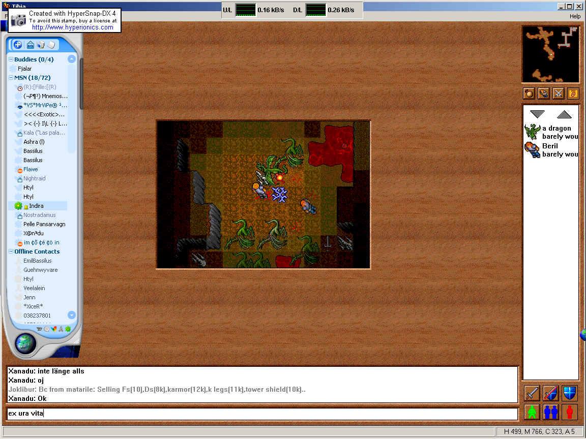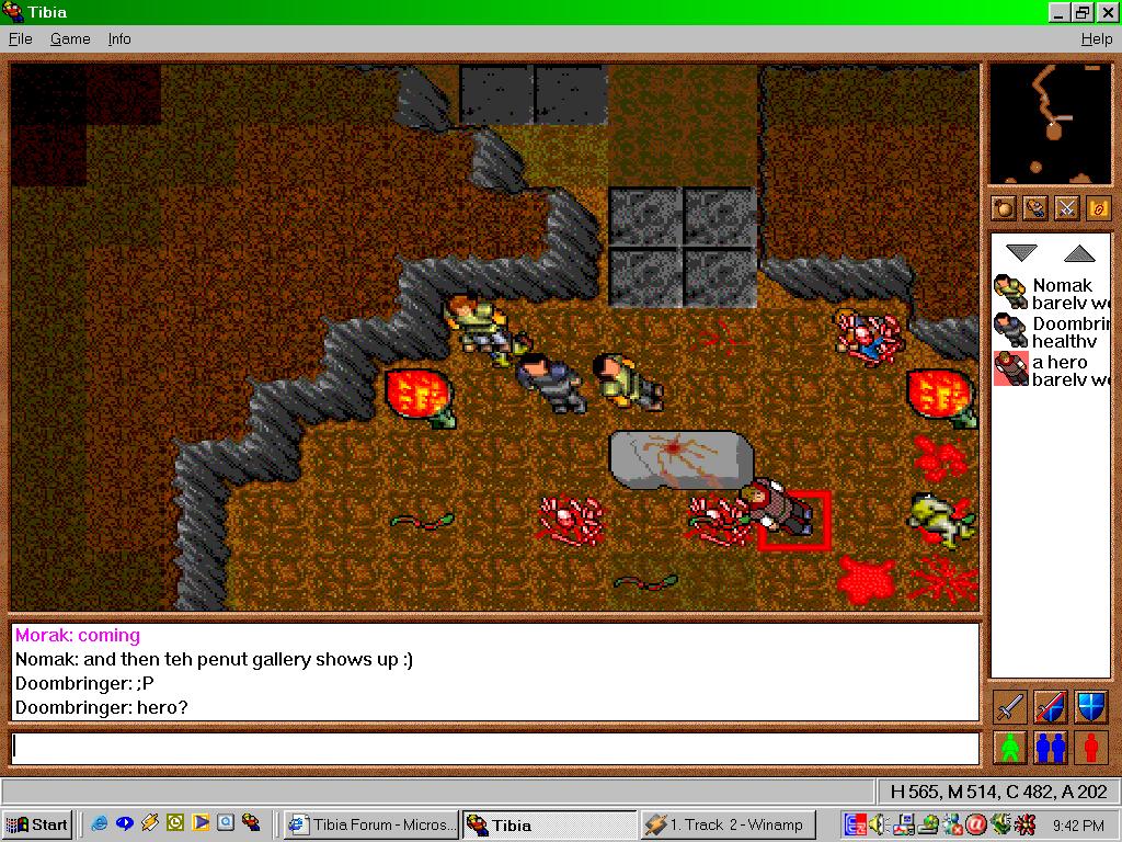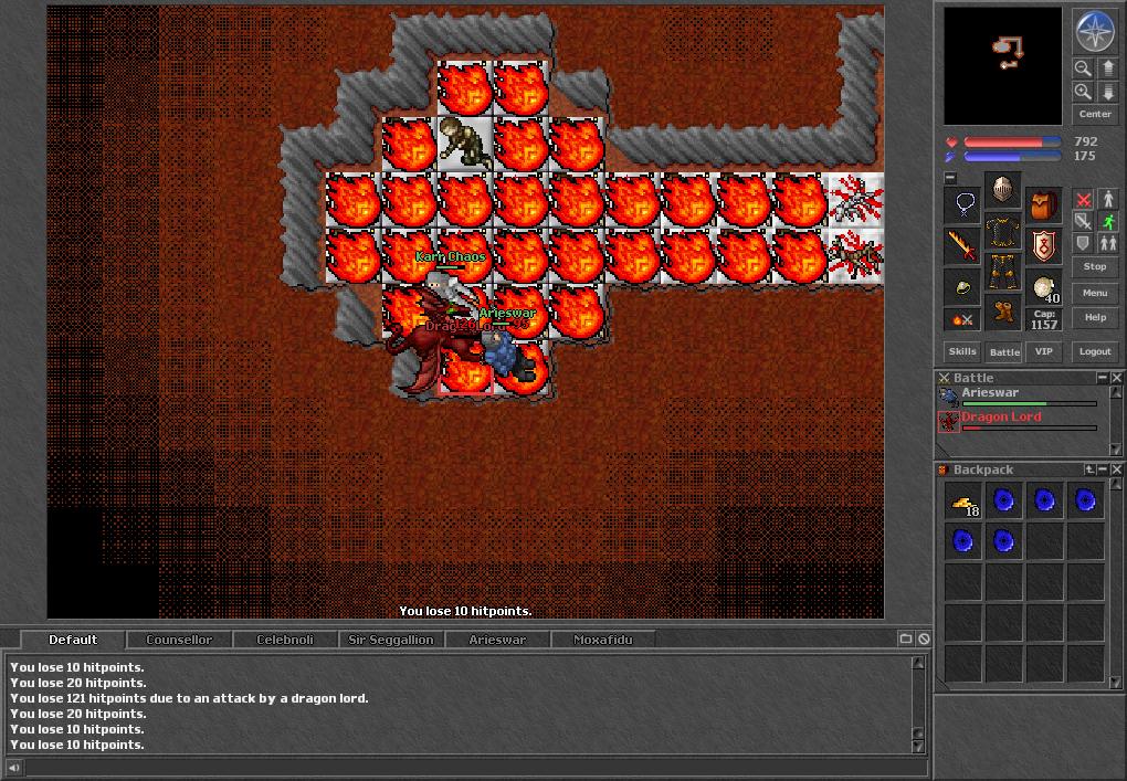 Back at the Monk you could head north and down a hole at the passageway split and find yourself in a large room which was blocked by stalactites which you could navigate around. Three Dragons spawned in this room who would shore magic at you while you tried to get close to them. A hole in the middle of the room let you drop down to a room and passageway containing more Monks and your first Hero. These fallen heroes were some of the stingiest monsters in Tibia but offered reasonable experience and luck-based loot. Very rarely they would drop the much sought-after Crown set pieces which was some of the best armor most players would find. More often then not you would only get a piece of two in an entire hunt and nothing else but a little bit of gold.