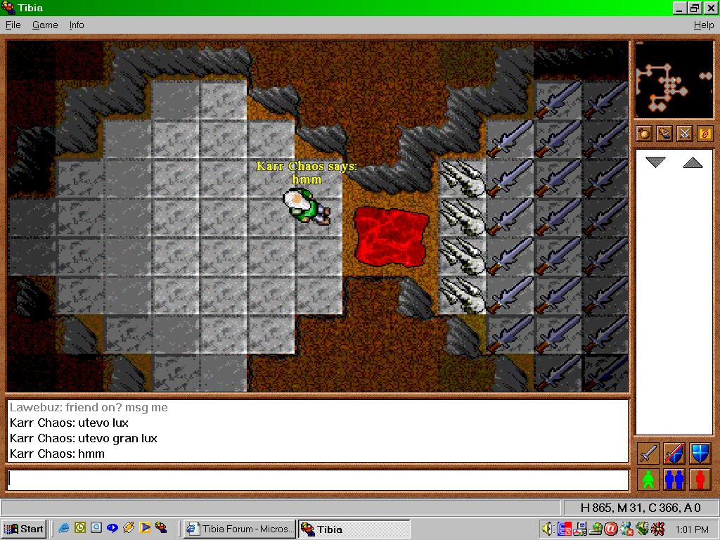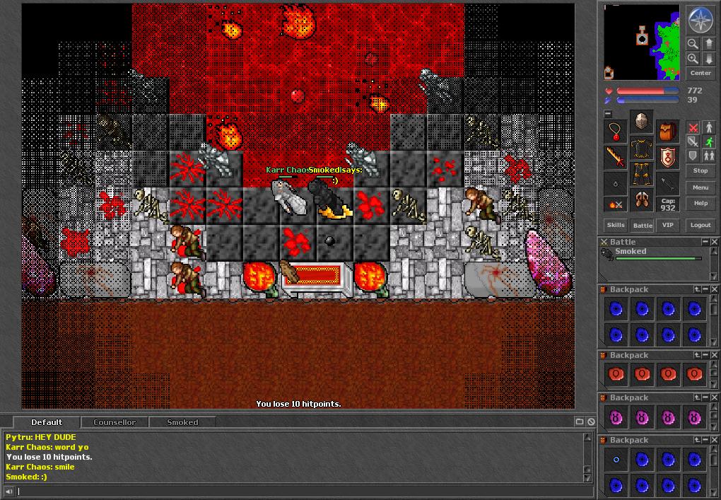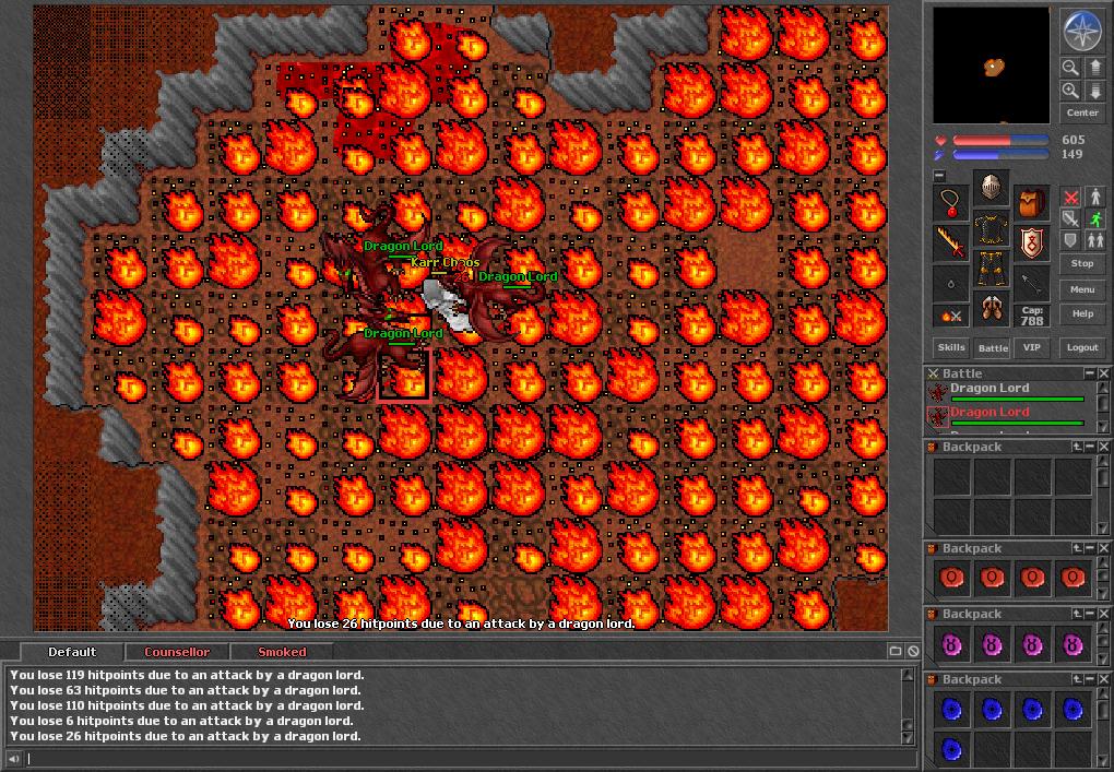 Back at the Hero after the Dragon you could head north and down a ladder to a room filled with creatures that would attack you when you dropped down. You could fight your way through them to the south. Along the way to the south on the black marble floor was four rooms which had ladders leading down into two additional levels. Each of these room had creatures you could kill which were more exotic creatures like Monks, Heroes, and Priestess. I believe there was a multi shot UH rune that spawned here which you could take which was quite rare. One of the rooms had the largest Hero spawn in Tibia consisting of three Heros on the lowest level. These lower levels were a brick room surrounded by Lava outside.