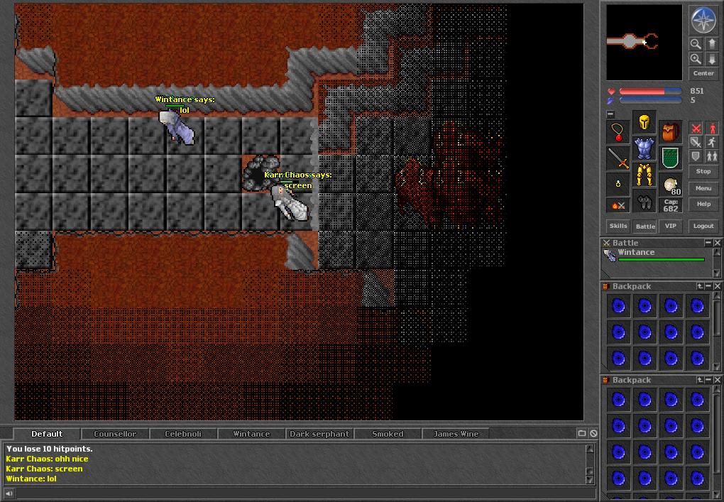 Once you dropped down from the Beholder area you would be attacked by the new Monk. From here, traveling east took you on a black marble walkway to a split in the hallway. Heading south then east would take you past a strange multi-level room which had brick and beige walls in a strange pattern. Ignoring this room for now you might head east again, across a narrow wooden walkway to a deep lava river and then a ladder that led to a star shaped room. This room had five floor switches on the points and a Beholder, Priestess, Elf Arcanist, Mino Mage, Orc Shaman, and two DS spawned in the room. Players tried everything to get the switches to depress and thought there was some secret to the area, perhaps even involving clues found in the previous strange wall room. A rumor was going around that the new Tomes had something to do with the puzzle, but they were far too rare for players to obtain to test this theory. It was at this point that I wanted to find these tomes for myself to test out a solution here. Unsurprisingly it would take a long time before anyone had gathered the tomes to try this out and of course, like most of Tibia's mysteries, it resulted in nothing.