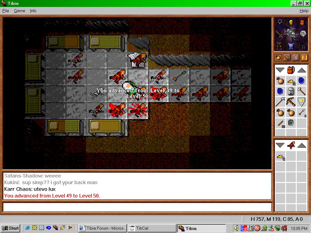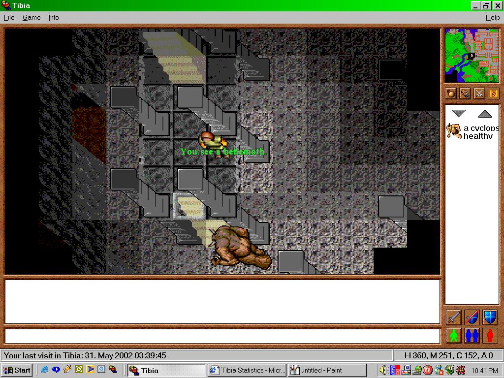 This lowest floor was massive and provided the new Behemoths, Cyclops, and some Dwarven Soldiers to kill which could be easily fatal if too much was lured to the stairs. If you were brave, you could even go into the six spiral arms which had more Behemoths and stairs which led up to smaller rooms with again more Behemoths. This was considered near impossible as you could face up to four Behemoths in the small upper rooms which was more than anyone in Tibia could handle at the time.