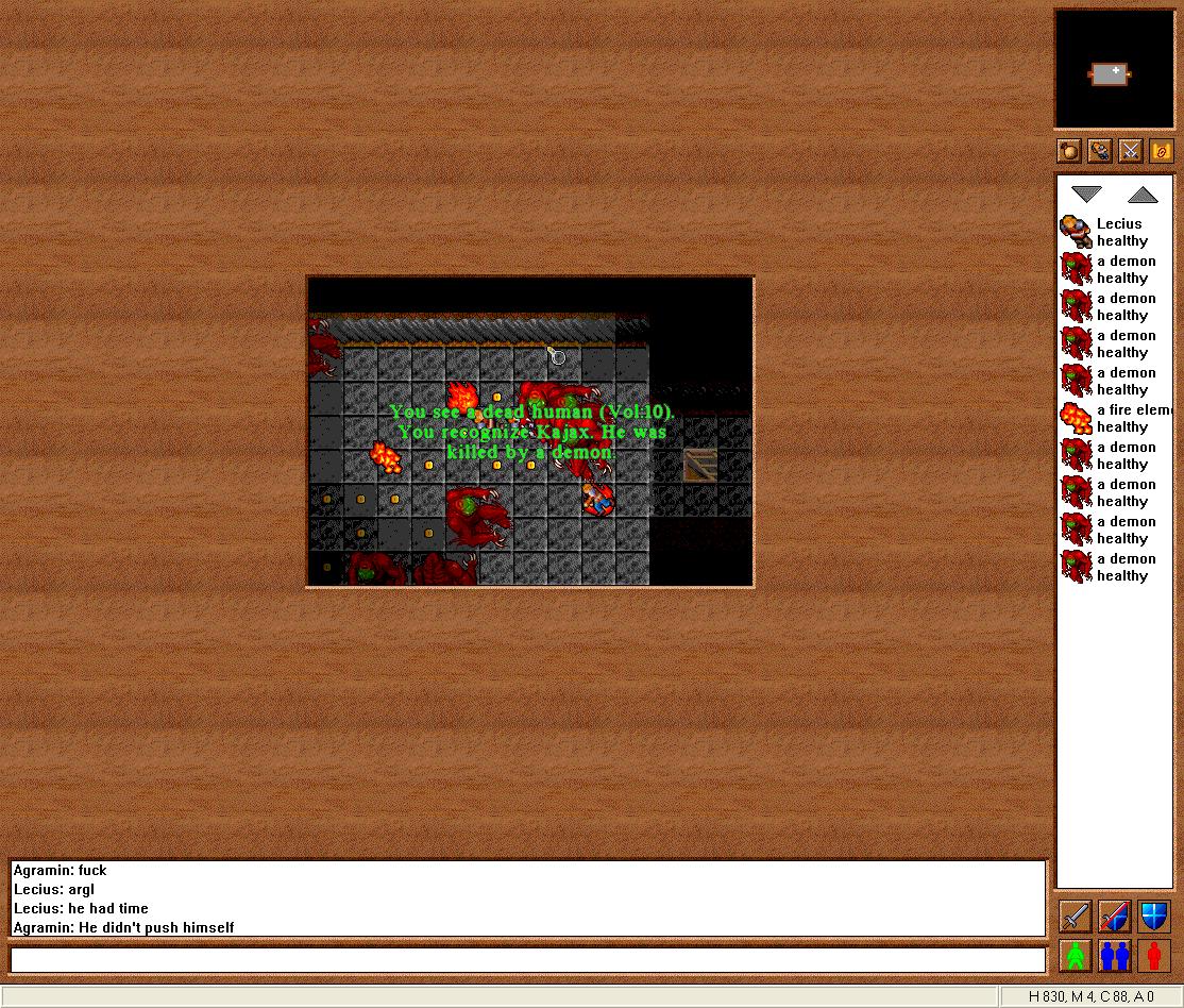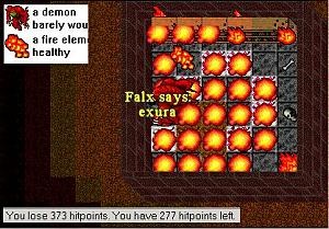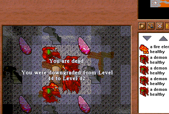 Taking the ramp down led to a single Demon and was a popular place to level. There was an overlook to the east which had a hole down to a room with five more Demons milling about. After you steeled yourself and jumped down the hole you would not find yourself in that room but one below that had two Demons in a hall with fire fields. A Staircase to the west would take you up two flights of stairs back to the previous room. The five Demon room could be hunted by levitating off the edge, but this was risky and generally not worth it.