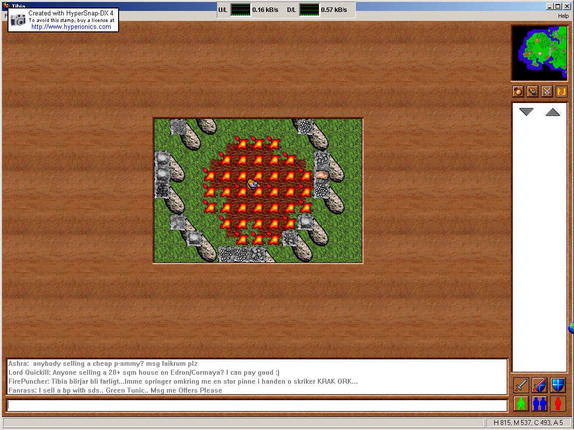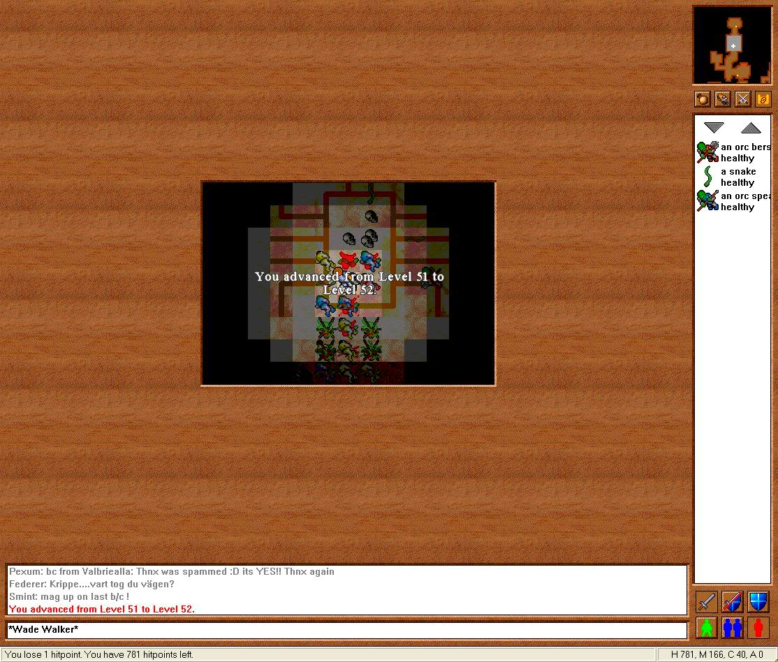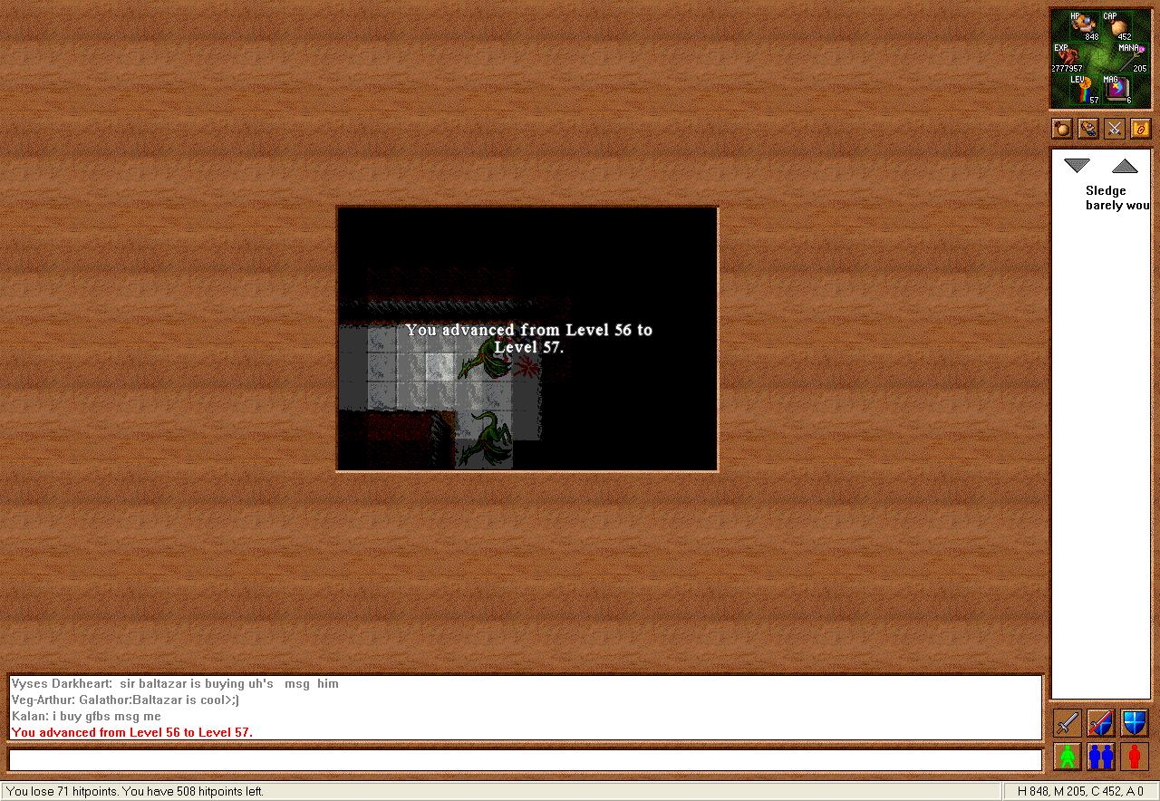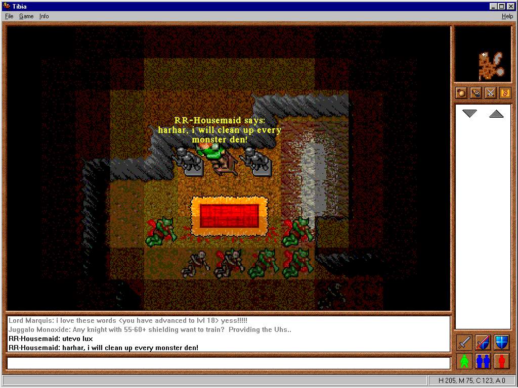 The next three floors down were mainly Cyclops, but one room had a ton of Iron Pieces so players would often swing by and pick these up. You would also encounter the new Fire Elemental just before this room, so it was a nice diversion, even if the monster was dangerous and dropped no loot. On the fourth was a room which had tons of Giant Swords hidden behind a lava pool which seemed to be owned by the Cyclops. These were not accessible, but the weapon was rare, so people drooled over the room. A room with chests nearby also enticed players but was also inaccessible though the portals which surrounded it caused many adventures to dream of what hidden treasures might lay inside. Before you could enter the fifth floor you would find three Fire Elementals clustered around the exit which was quite difficult. This point marked the end of the easy upper dungeon and provided the high-level dungeon below.