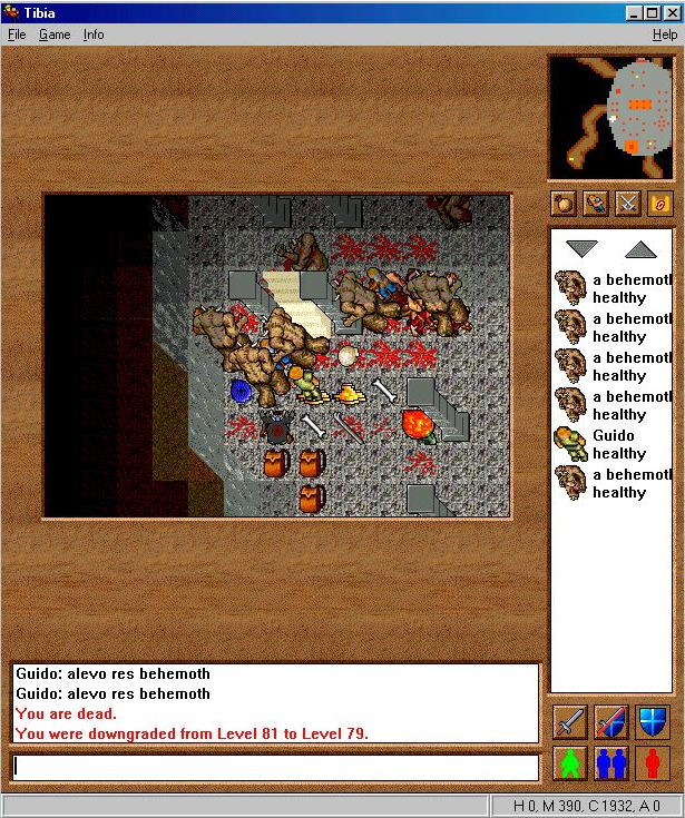 Very early into their introduction, it was discovered that the best way to handle them was to avoid their melee which could be very deadly and run them around objects or people. Creatures did not retarget once they attacked so you could lure them around while others hit on them, avoiding their most damaging attack. Mages would stack at the stairs while a knight or paladin ran them around, though if the blocker got kicked the players by the stairs would have to rush up the stairs before they were smoked by the brutal Behemoth melee. The blocker was not damage free either as they would still pelt you with stones which still did considerable damage but was manageable if you avoided luring other monsters which was difficult to do. These beasts were very fast and could cast haste which eliminated the gain on luring them around the map for a shot bit. It was very expensive to kill even one of these and it took a lot of time to chip away at their high health.