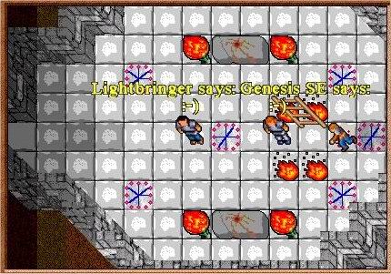 Once you had two players stand on the switch you could squeeze through and dodge the fire fields that were on the way. At the end of the path was a fearsome sight and your next challenge. 8 Demons milled about in an open pit with a ladder leading down. This was often fatal but there was a trick to navigating the area safely, a hidden PZ on certain squares could be found if you stepped correctly and got to the other side. You couldn't see what tile was a PZ was so you would only know that you took the wrong path if you were attacked after moving. Learning the pattern was a very slow process and cleaning the room was too difficult as you would be attacked by most of the red beasts at the same time.