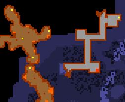 In the hallway was a broken path to the west which led to a Beholder and some DS. Taking the hole down would lead you to some Monks, Priestess, and Wild Warriors which would immediately assault you at the steps. Once beaten, you could head south to a large room that had a larger Hero spawn, consisting of two. To the east was a path which led down to a platform with DS and Fire Elementals. Everything around here was surrounded in lava and fire, but there was a dilapidated house though no way to get to it.