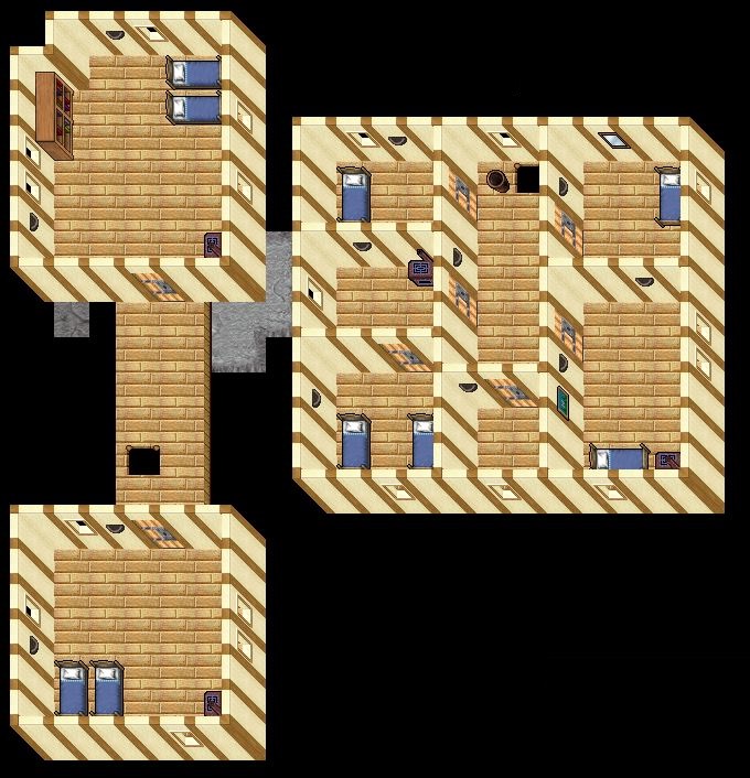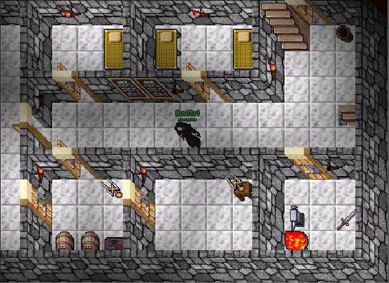 East of Thais was a new hall along the river which was called Bloodhall and would be the clan home of the Black Dragon guild. The first floor had a large library to the southeast and two small rooms along the west side. A small room to the east provided access to the other floors with a ladder to the basement leading to a medium size storage room and a bizarrely arranged 8 bedroom to the west. Taking the ladder in the small room on the first floor up led to an area like the Wolf Tower kitchen which had a large table and kitchen room in the north which had casks. A ladder in the small room took you to the same layout as the other hall's sleeping quarters, providing four bedrooms and a ladder which led to the roof. The roof was exactly like Wolf complete with a middle room and ladder leading to small roof area above. This hall had a total of 16 beds which was smaller than the other hall.