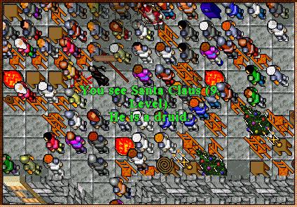 Fortunately Christmas cheer was at an all-time high in 2001 but a holiday wouldn't be the same without a splash of violence. That violence came with the return of Santa who was played by Knightmare. The sprite for Santa didn't line up well in the battle menu so it looked tiny compared to the avatar. CIP had decided to scrap the Christmas Peace from the previous year due to the backlash which meant the Tibian population would be extra violent this year. Santa visited several towns without incident, but this would be short lived when he went to Kazordoon. The mob is Tibia and Santa proved quite mortal when he was PKed by a group of players hoping to get some free rare items. I recall Santa making an angry BC before logging out in a huff - no more presents for Tibian's this year. Future Santa would now be immortal.