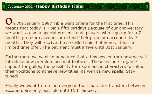 On January 7th, 2002 Tibia celebrated its fifth birthday. To commemorate the event a Shield of Honor, a new and pretty decent shield, was offered to players who signed up for a 7 month premium account by January 31st. This was the first and only time CIP would offer an in game item for premium as players hated the idea of paying for advantage in these early years and complained loudly on the forum. The shield was even better then the already in demand Crown Shield and the next best shield was the MM which very pricy (180k). Players jumped to buy premium to get the shield which would sell for 30k when they were ready to transition to the next shield. At the end of the event CIP would mail the shield to your home depot. This shield can sell for upwards of 500million making those who held onto the rare item very wealthy even today.