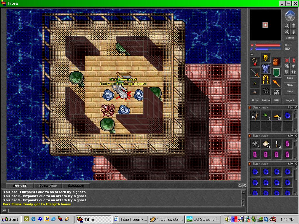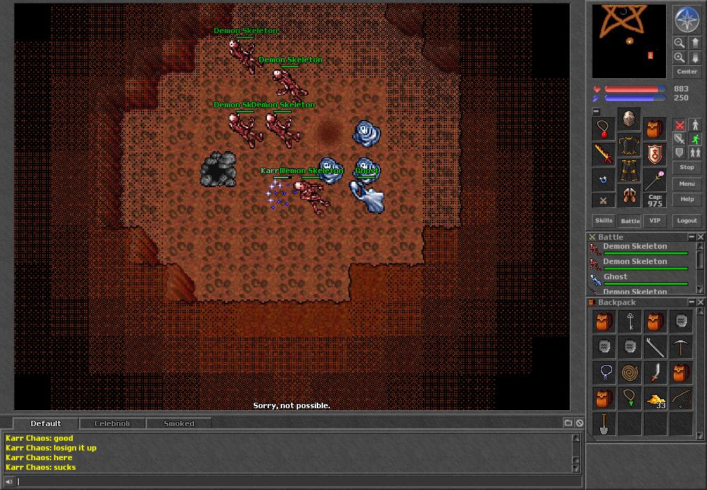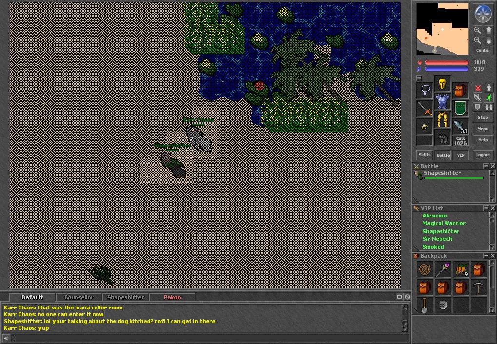 To the south of the continent was open ocean which was very close to town as the Ankrahmun landmass didn't yet exist. To the west of town was two more, two-story Wasp towers, one to the north and the other to the south. I believe there was two Rot dungeons under the sand and possibly a Skeleton dungeon which could be accessed by a loose stonepile in the side of a rocky mountain to the south called the Plague Spike. North of this was an interesting desert mirage which when you approached looked like a lush oasis but when arriving at the location you would find only sand. Further north was an elevated hill which was surrounded by dead trees. A flat spot to the south allowed access by parcel or levitation to a single Giant Spider. This was a popular spot for players who wanted to just kill one of these at a time with little risk.