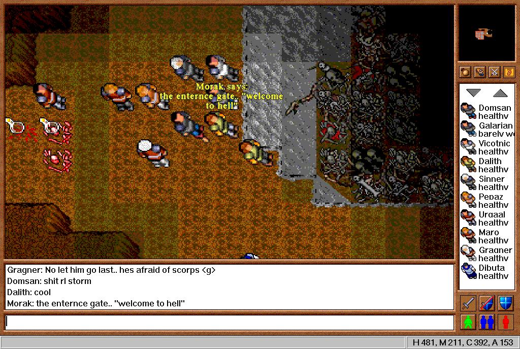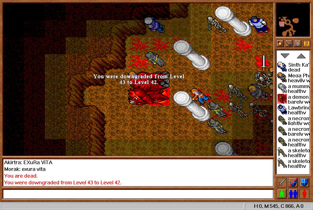 Going south of the death pit took you to a couple of rooms of Necomancers, one of which was filled with cauldrons and the other beds. The middle room had five DS that had a hole leading to some Ghosts and more DS in a small room which was difficult to clear. Going down the next hole led to a long path filled with Vampires, Ghouls, and DS in a long snaking road from west to north. Coffins could be found in the upper rooms as could some Stalkers and Mummies. This area was incredibly popular as players found the area very profitable as Vampires dropped the Vampire shield, Ice Rapier, and Spike Sword which sold for high prices and were in demand.