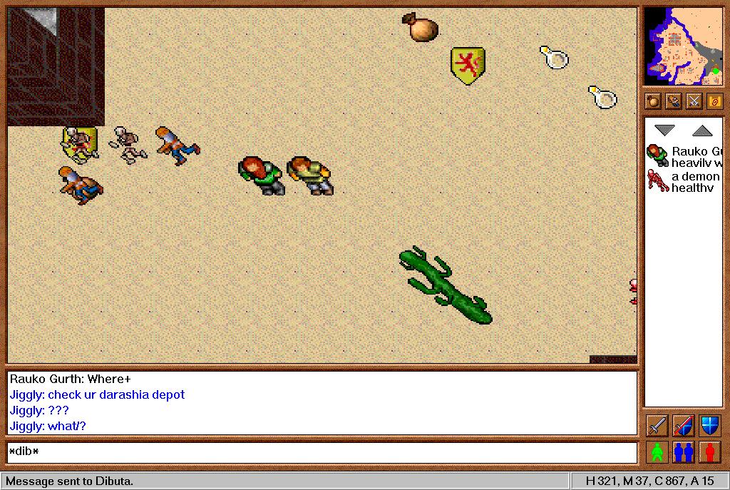 At the northeast of town was a large storage building located in a rocky hill. A staircase led to a three-story high Wasp dungeon which had four separate towers and was covered in flowers. From here you could explore the desert around town, called by the locals "the Devourer", which offered Poison Spiders, Deer, Lions, Scorpions, and Wasps.